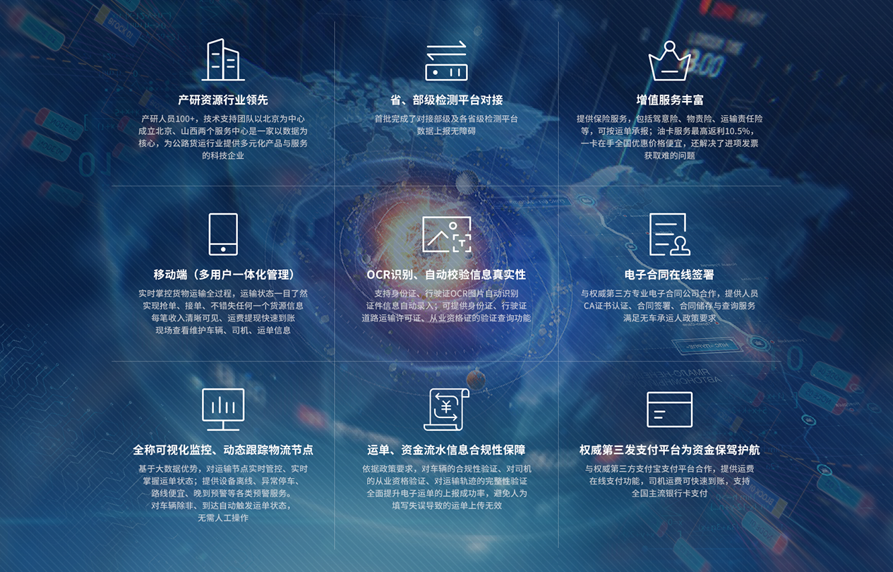 构建人、车、货一体化全程的网络货运平台系统,基于阿里云部署提供稳定可靠的安全服务。 倾力与为公路货运行业提供全方位的产品和服务解决各类行业痛点。